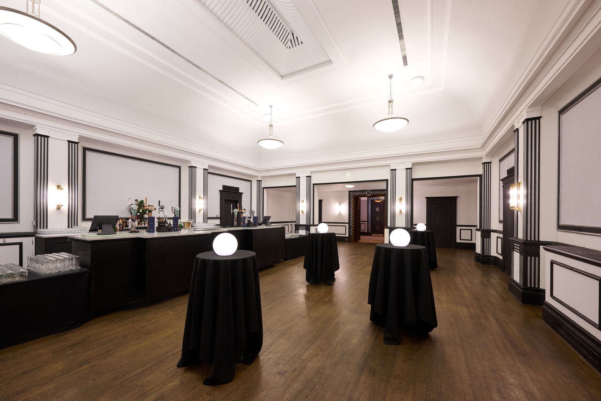 Spacious and chic, this flexible space makes a great bar area for the neighbouring Queens Ballroom.